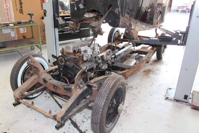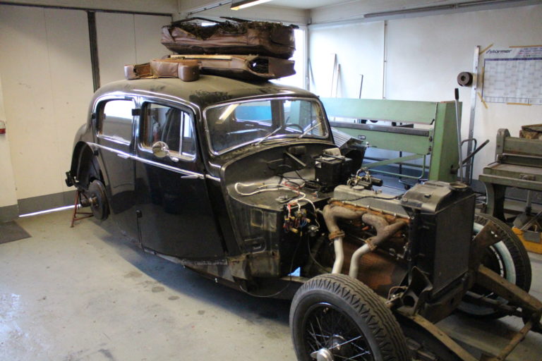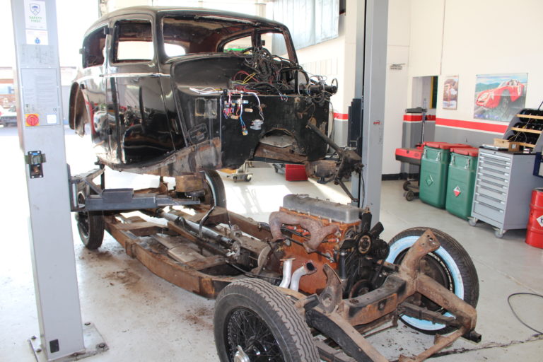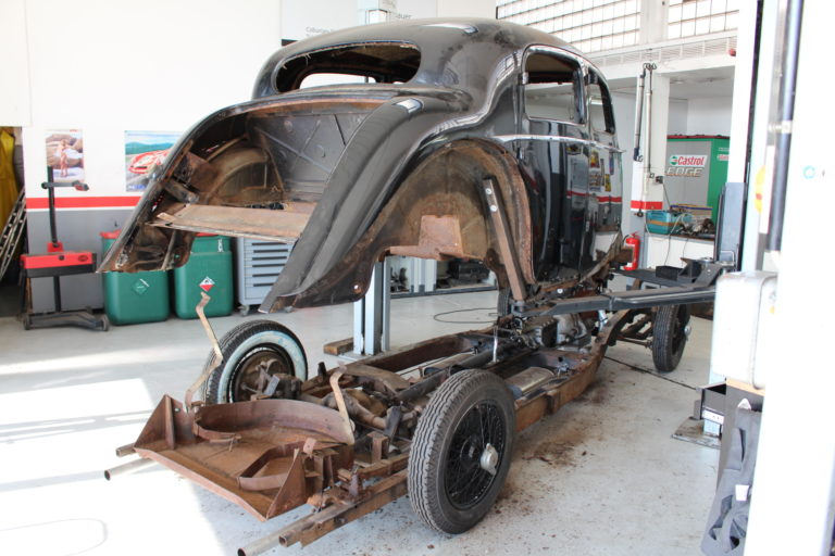 Das Fahrzeug wird Schritt um Schritt ausgeschlachtet bis am Ende nur noch das Häuschen und der Fahrzeugrahmen übrig bleiben. Die Häuschen, der Rahmen und die Blechteile werden extern zum Sandstrahlen gegeben. Die zu verchromenden Teile werden erst repariert um anschliessend zum Verchromen zu geben.